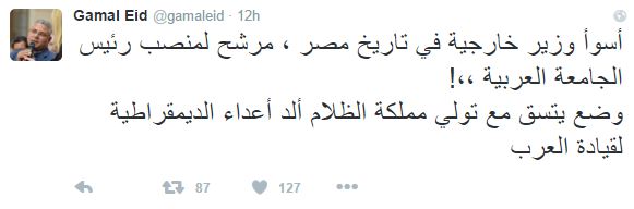 وقال -عبر تغريدة له على “تويتر”-: “أسوأ وزير خارجية في تاريخ مصر، مرشح لمنصب الأمين العام للجامعة العربية.. وضع يتسق مع تولي مملكة الظلام ألد أعداء الديمقراطية لقيادة العرب”.