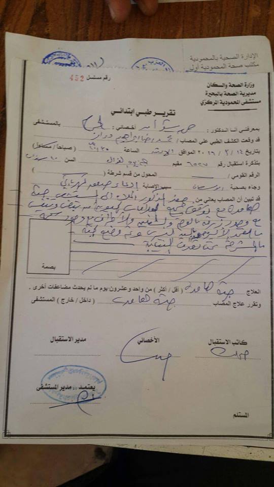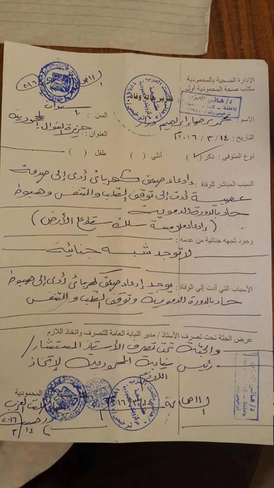 وأوضح مفتش الصحة أثناء توقيع الكشف الطبي على الطالب وجود زرقة بالوجه والشفتين والأطراف مع وجود سحجة بالفخذ اليسرى وحرق باليد اليسرى جراء صعق كهربائي.