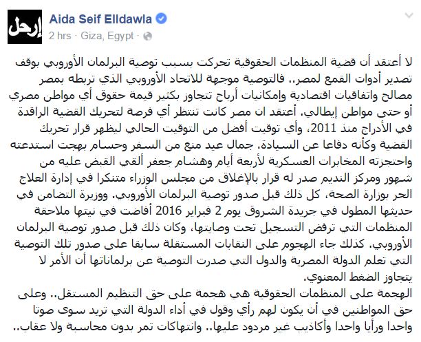 وقالت “سيف الدولة” -عبر “فيس بوك”-: “لا أعتقد أن قضية المنظمات الحقوقية تحركت بسبب توصية البرلمان الأوروبي بوقف تصدير أدوات القمع لمصر.. فالتوصية موجهة للاتحاد الأوروبي الذي تربطه بمصر مصالح واتفاقيات اقتصادية وإمكانيات أرباح تتجاوز بكثير قيمة حقوق أي مواطن مصري أو حتى مواطن إيطالي”.
