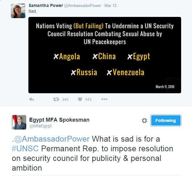 ودخلت مصر في سجال مع ممثلة الولايات المتخدة الأميركية بالأمم المتحدة سامنثا باور التي وصفت امتناع مصر عن التصويت على المقترح الأميركي بشأن “ترحيل المتورطين من قوات حفظ السلام حال الاشتباه بارتكابهم جرائم انتهاكات جنسية”، بـ”المحزن”، وذلك عبر تغريدة لها على “تويتر”.