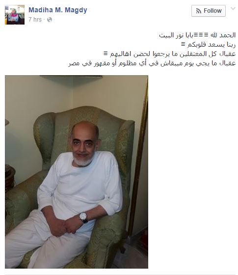 وقالت ابنة “قرقر” -في منشور لها على “فيس بوك”-: “الحمد لله بابا نور البيت، ربنا يسعد قلوبكم، عقبال كل المعتقلين”.