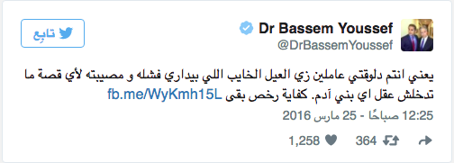 وقال عبر “تويتر”:”أنتم دلوقتي عاملين زي العيل الخايب اللي بيداري فشله ومصيبته بأي قصة ما تدخلش عقل أي بني آدم”، متابعًا: “كفاية رخص بقى”.