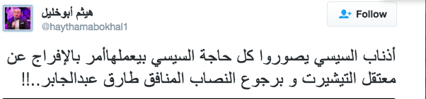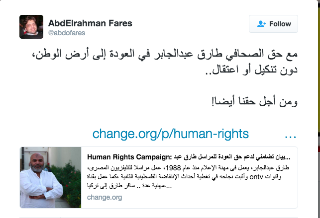 وقال الإعلامي بقناة الجزيرة “زين العابدين توفيق” ، كإعلامي مصري مقيم في الخارج لست نادمًا على اي كلمة قلتها ضد ظلم وغباء النظام ، مضيفًا :”لست راغبًا في العودة الى مصر ما بقي فيها هذا النظام الظالم، ولا مانع لدي أن أدفن في أي أرض تغدق بالعدل والكرامة على من يخطو عليها”.