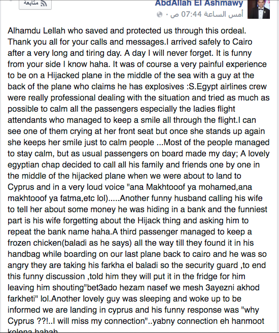 كتب عبدالله العشماوي، أحد ركاب رحلة “مصر للطيران” المخطوفة، وهو طبيب جراحة العظام الذي يعيش في بريطانيا، بعض المواقف التي حدثت على متن الطائرة بعد اختطافها.