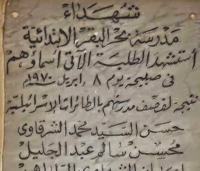 اليوم الثامن من أبريل .. الذكرى الـ 46 لمذبحة بحر البقر التي ارتكبتها قوات الاحتلال الإسرائيلي ،عام 1970 في حق أطفال الشرقية ، حيث قصفت مدرسة بحر البقر بعدة صواريخ، ما أدى لاستشهاد 30 تلميذًا، وإصابة أكثر من 50 آخرين.