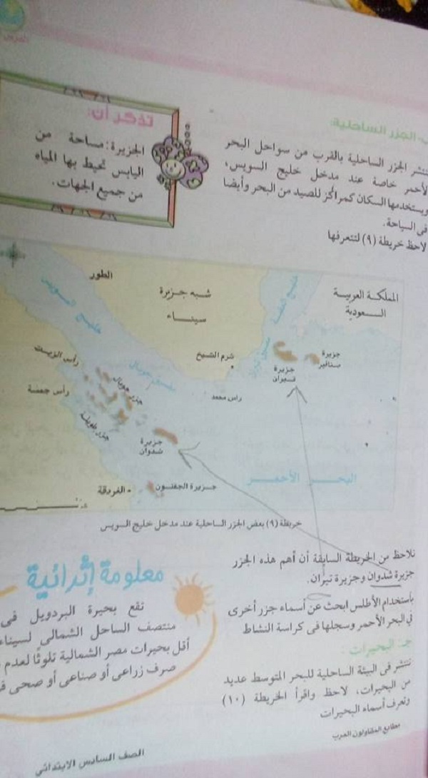 تداول رواد مواقع التواصل الاجتماعي، صورًا لخريطة مصر بالصف السادس الابتدائي بمنهج الجغرافيا، توضح وجود جزيرتي صنافير وتيران ضمن الجزر المصرية في خليج العقبة.