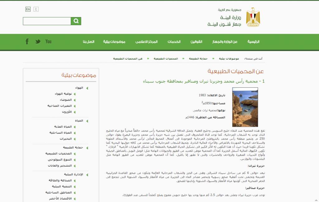 وأوضح أن وصف الجزيرتين منشور منذ عشر سنوات ضمن وصف لجميع المحميات المصرية والمناطق التابعة لها ومنها محمية رأس محمد، وستقوم الوزارة بتحديث المعلومة على موقعها بالدرجة التي سيصل إليها الاتفاق بين الجانبين المصري والسعودي.