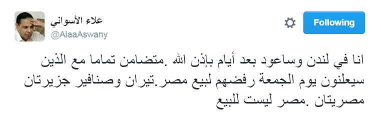 أعلن الكاتب علاء الأسواني، تضامنه مع دعوات التظاهر، غدًا الجمعة؛ احتجاجًا على قرار التنازل عن جزيرتي “تيران وصنافير” للسعودية.