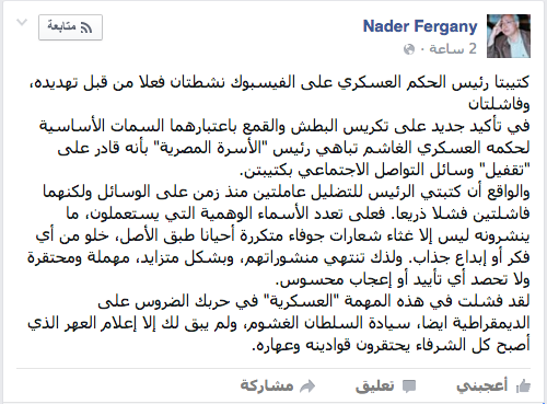 قال الدكتور نادر فرجاني، أستاذ العلوم السياسية بجامعة القاهرة، إن :”كتيبتا رئيس الحكم العسكري على “الفيس بوك” نشطتان فعلاً من قبل تهديده، وفاشلتان، في تأكيد جديد على تكريس البطش والقمع باعتبارهما السمات الأساسية لحكمه العسكري الغاشم “.