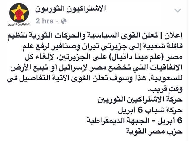وكتبت حركة الاشتراكيون الثوريون، على صفحتها الرسمية بموقع التواصل الاجتماعي “فيس بوك”: “إعلان.. تُعلن القوى السياسية والحركات الثورية تنظيم قافلة شعبية إلى جزيرتي تيران وصنافير لرفع علم مصر (علم مينا دانيال) على الجزيرتين؛ لإلغاء كل الاتفاقيات التي تخضع مصر لإسرائيل أو تبيع الأرض للسعودية، هذا وسوف تعلن القوى الآتية التفاصيل في وقتٍ قريب، حركة الاشتراكيون الثوريون، حركة شباب 6 أبريل، 6 أبريل- الجبهة الديمقراطية، حزب مصر القوية”.