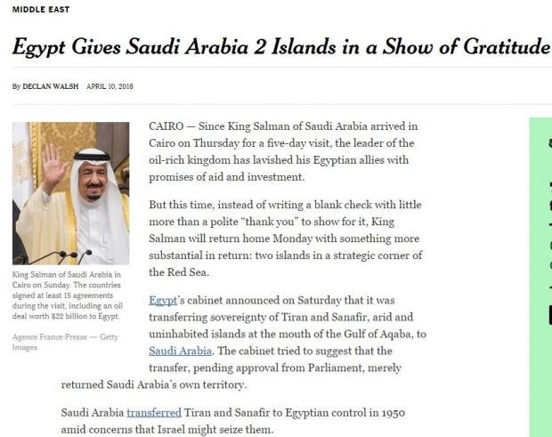 تداول نشطاء مواقع التواصل الاجتماعي تقريرًا نشرته صحيفة “نيويورك تايمز” الأميركية، مشيرة في تحليلها إلى أن الملك سلمان بن عبدالعزيز اعتبر أن مصر أهدت له جزيرتي تيران وصنافير في مقابل المساعدات الاقتصادية.