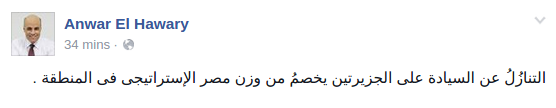 وقال -عبر منشور له على “فيس بوك”-: “التنازل عن السيادة على الجزيرتين يخصمُ من وزن مصر الإستراتيجي في المنطقة”.