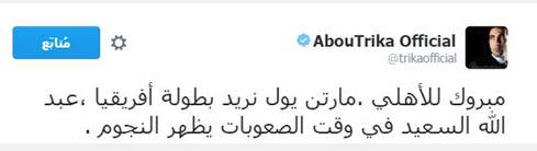وكتب “تريكة” -عبر حسابه على “تويتر”-: “مبروك للأهلي، مارتن يول نريد بطولة إفريقيا، عبدالله السعيد في وقت الصعوبات يظهر النجوم”.