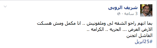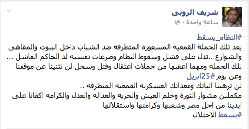 وأضاف خلال منشور له على صفحته على “فيس بوك” : تلك الحمله ومهما أعقبها من حملات اعتقال وقتل وسحل لن تثنينا عن موقفنا وعن يوم 25 أبريل.