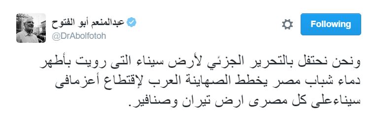 أعرب الدكتور عبدالمنعم أبو الفتوح، رئيس حزب “مصر القوية”، عن دهشته من الاحتفال بعيد تحرير سيناء في ظل التنازل عن تبعية جزيرتي “تيران وصنافير” للسعودية.