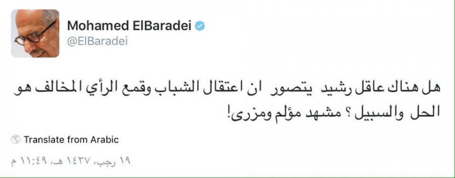 وقال البرادعي، خلال تغريدة له نشرها عبر حسابه الشخصى على “تويتر”: “هل هناك عاقل رشيد يتصور أن اعتقال الشباب وقمع الرأي المخالف هو الحل والسبيل؟.. مشهد مؤلم ومزرٍ.