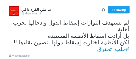 وقال -عبر تغريدة له عبر على “تويتر”-: “لم تستهدف الثورات إسقاط الدول وإدخالها بحرب أهلية، بل أرادت إسقاط الأنظمة المستبدة، لكنَّ الأنظمة اختارت إسقاط دولها لتضمن بقاءها”، مذيلاً تغريدته بهاشتاج “حلب تحترق”.