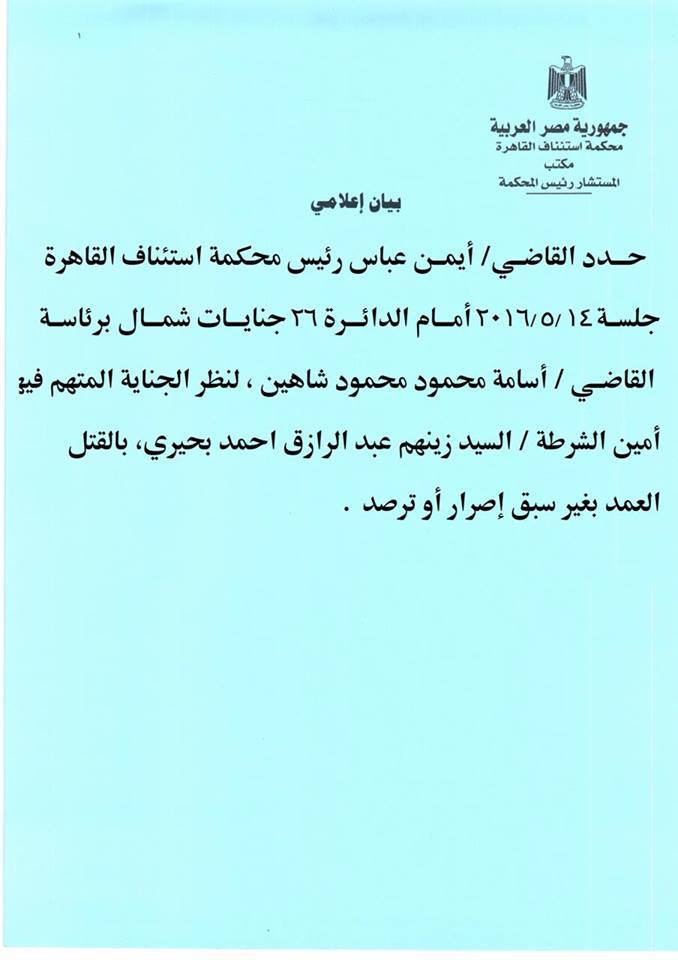 حددت محكمة استئناف القاهرة برئاسة المستشار أيمن عباس، جلسة 14 مايو المقبل، لنظر أولى جلسات محاكمة أمين الشرطة السيد زينهم عبدالرازق أحمد بحيري، المتهم بقتل بائع منطقة الرحاب.
