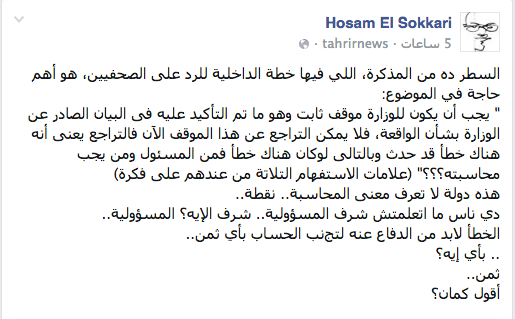 – يجب أن يكون للوزارة موقف ثابت وهو ما تم التأكيد عليه في البيان الصادر عن الوزارة بشأن الواقعة، فلا يمكن التراجع عن هذا الموقف الآن فالتراجع يعني أن هناك خطأ قد حدث وبالتالي لوكان هناك خطأ فمن المسئول ومن يجب محاسبته؟؟؟.