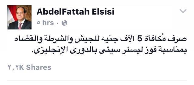 في سياق آخر، سخر رواد موقع التواصل الاجتماعي “فيس بوك” من فوز ليستر بالدوري؛ حيث كتب بعضهم “سيتم صرف مكافأة 5 آلاف جنيه للجيش والشرطة والقضاة بمناسبة فوز ليستر بالدوري الإنجليزي”.