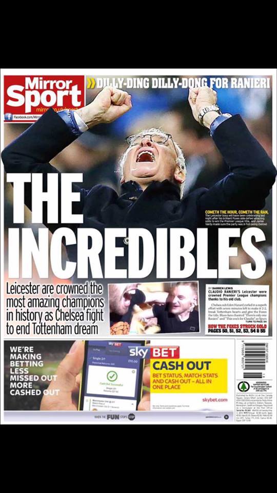 وتوّج ليستر رسميًا بلقب الدوري الإنجليزي للموسم الحالي، للمرة الأولى في تاريخه، بعدما سقط منافسه توتنهام في فخ التعادل أمام نظيره تشيلسي بنتيجة (2-2)، في المباراة التي جمعتهما على ملعب “ستامفورد بريدج” في ختام المرحلة 36 من المسابقة.