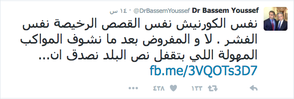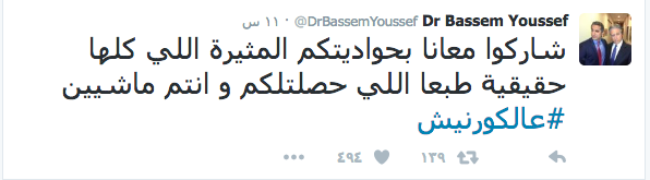 أنشأ باسم يوسف هاشتاج “عالكورنيش”، دعا فيه جميع المتابعين إلى المشاركة بقصصهم الساخرة من خلاله.