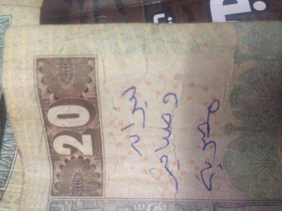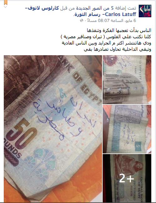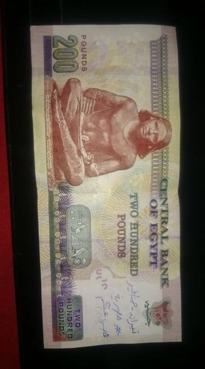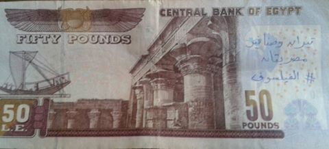 وعلقت الصفحة على صور العملات النقدية من جميع الفئات: “الناس بدأت تعجبها الفكرة وتنفذها.. كلنا نكتب على الفلوس “تيران وصنافير مصرية”.. ودي هاتنتشر أكترمن الجرايد وبين الناس العادية.. وتبقى الداخلية تحاول تصادرها بقى”.