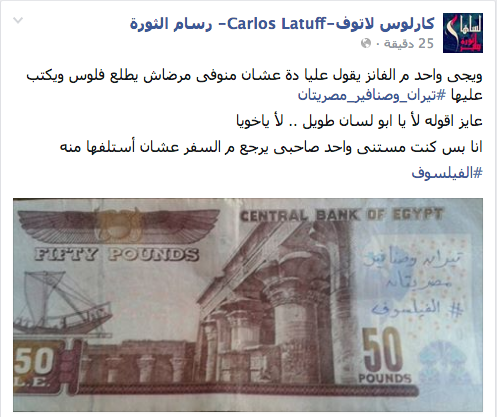 نشرت صفحة “كارلوس لاتوف” رسام الكاريكاتير المهتم بالثورة المصرية، صورًا للعملات النقدية المصرية وعليها عبارة “تيران وصنافير” مصريتان.