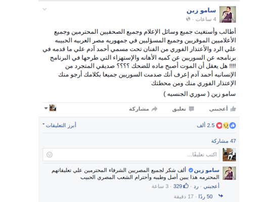 وقال سامو زين، عبر صفحته الرسمية بموقع التواصل الاجتماعي “فيس بوك”: “أطالب وأستغيث بجميع وسائل الإعلام وجميع الصحفيين المحترمين وجميع الإعلاميين الموقرين وجميع المسؤولين في جمهورية مصر العربية الحبيبة على الرد والاعتذار الفوري من الفنان تحت مسمى أحمد آدم على ما قدمه في برنامجه عن السوريين عن كمية الإهانة والاستهزاء التي طرحها في البرنامج”.