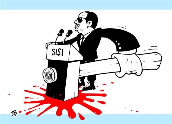 ونشر موقع “بوليتكال كارتونز” رسمًا تحت عنوان “New Egyptian Dictator” يكشف فيه عن دموية حكم السيسي.