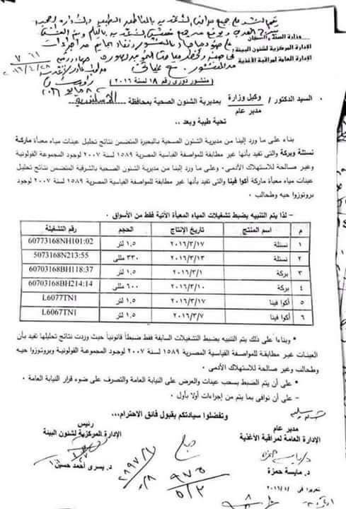 جاء ذلك في المنشور الدوري الذي وزعته وزارة الصحة والسكان على الإدارة المركزية لشؤون البيئة والإدارة العامة لمراقبة التغذية الذي يحمل رقم 18 لسنة 2016م، أنه بناءً على ما ورد إليهم من بلاغات من قبل مديريتي الشؤون الصحية بالبحيرة والشرقية حول نتائج تحليل عينات مياه معدنية معبأة ماركة “نستله وبركة وأكوا فينا”، والتي تفيد أنها غير مطابقة للمواصفات القياسية المصرية 1589 لسنة 2007 والتي أظهرت نتائج التحاليل للعينات العشوائية احتواءها على المجموعة القولونية ووجود بكتيريا (بروتوزوا) حية وطحالب بها، مما يجعلها غير صالحة للاستهلاك الآدمي.