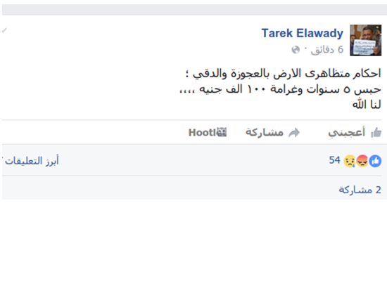 وأكد المحامي طارق العوضي، على حسابه بموقع التواصل الإجتماعي “فيس بوك”، صدور أحكام بالحبس 5 سنوات وغرامة 100 ألف جنيه لمتظاهري جمعة الأرض بالعجوزة والدقي.