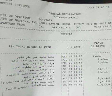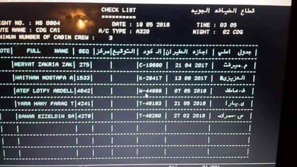وبحسب بيان الشركة فإن بياناتهم كالآتي: محمد سعيد علي علي شقير (قائد الطائرة) ومحمد أحمد ممدوح أحمد عاصم (الطيار المساعد)، وطاقم الضيافة: ميرفت زكريا زكي محمد، وعاطف لطفي عبداللطيف أمين، وسمر عزالدين صفوت، ويوسف هيثم مصطفى عبدالحميد العزيزي، ويارا هاني فرج توفيق، وطاقم أمن الطائرة: محمود أحمد عبدالرازق عبدالكريم، وأحمد محمد مجدي أحمد، ومحمد عبدالمنعم الغنيمي الكيالي.