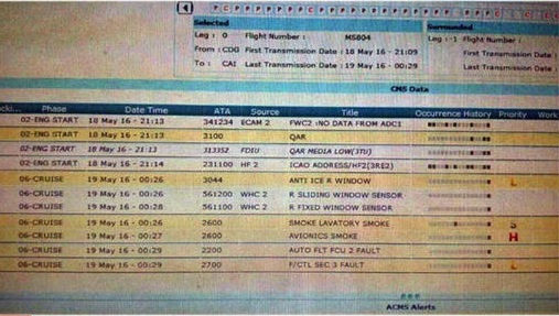 وتظهر الوثيقة وجود إنذار بالدخان في الساعة 00:26 بتوقيت جرينيتش (الساعة 02:26 بتوقيت القاهرة)، وإنذار آخر بعدها بدقيقة، وجاءت تلك التحذيرات قبل حوالي 4 دقائق من اختفاء الطائرة من على شاشات الرادار؛ إذ أعلنت مصر للطيران أن الطائرة اختفت الساعة 02:30 فجر الخميس.