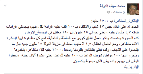 وأضاف “سيف الدولة”: “كده الصورة وضحت ونقدر نعمل اتفاق كويس مع السلطة والداخلية، فمع كل مظاهرة فيها عشرة آلاف متظاهر، ومع احتمال اعتقال ١.٥٪ منهم، نحط في خزينة الدولة ١٥ مليون جنيه بدل ما يقبضوا على الشباب، وكده نبقى بنتظاهر بفلوسنا وبمعدل ١٥٠٠ جنيه لكل متظاهر، ياخدوها ويأجروا بيها ١٠٠ مواطن شريف الواحد بـ١٠٠ جنيه للواحد، يعني عشرة آلاف جنيه، ويحطوا الباقي في جيبهم وكده يبقى الكل مبسوط وكسبان”.