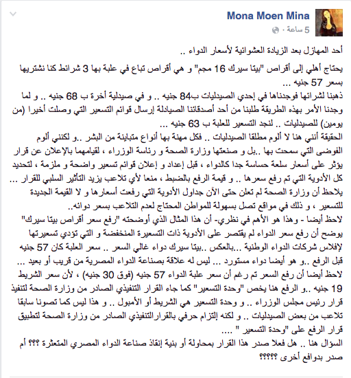 ونشرت خلال صفحتها الشخصية عبر “فيسبوك” شكوى من أحد الأهالي يقول فيها: “يحتاج أهلي إلى أقراص “بيتا سيرك 16 مجم” وهي أقراص تباع في علبة بها 3 شرائط كنا نشتريها بسعر 57 جنيهًا، ذهبنا لشرائها فوجدناها في إحدي الصيدليات ب84 جنيه .. وفي صيدلية أخرة ب 68 جنيهًا .. و لما وجدنا الأمر بهذه الطريقة طلبنا من أحد أصدقائنا الصيادلة إرسال قوائم التسعير التي وصلت أخيرا (من يومين) للصيدليات .. لنجد التسعير للعلبة ب 63 جنيهًا”.
