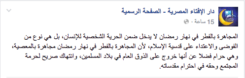 وأصدرت الإفتاء منشورا عبر الصفحة الرسمية للإفتاء، على موقع التواصل الاجتماعي “فيس بوك” قالت فيه: إن المجاهرة بالفطر “لا تدخل ضمن الحرية الشخصية للإنسان، بل هي نوع من الفوضى والاعتداء على قدسية الإسلام؛ لأن المجاهرة بالفطر في نهار رمضان مجاهرة بالمعصية، وهي حرام، فضلا عن أنها خروج على الذوق العام في بلاد المسلمين، وانتهاك صريح لحرمة المجتمع وحقه في احترام مقدساته”.