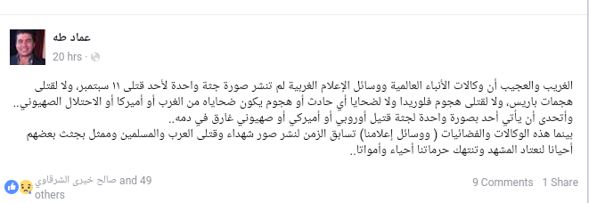 وقول الصحفي عماد طه: وكالات الأنباء العالمية ووسائل الإعلام الغربية لم تنشر صورة جثة واحدة لأحد قتلى ١١ سبتمبر، ولا لقتلى هجمات باريس، ولا لقتلى هجوم فلوريدا ولا لضحايا أي حادث أو هجوم يكون ضحاياه من الغرب أو أميركا أو الاحتلال الصهيوني.