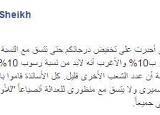 وقالت الدكتورة، في منشور لها عبر حسابها الرسمي على “فيس بوك”: “النسبة تحدد الامتياز بـ10% والأغرب أنه لابد من نسبة رسوب 10%، والعجيب أن هذا طبّق على الشعبة العربي فقط بحجة أن عدد الشعب الأخرى قليل”.