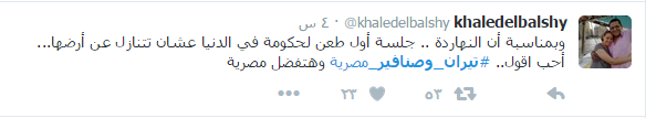 – خالد البلشي: “وبمناسبة أن النهاردة .. جلسة أول طعن لحكومة في الدنيا عشان تتنازل عن أرضها… أحب اقول تيران وصنافير مصرية وهتفضل مصرية”.