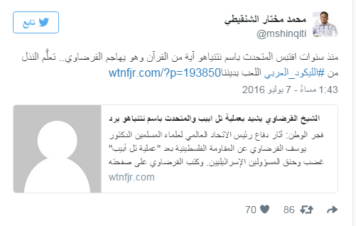 وصف أستاذ تاريخ الأديان بكلية قطر للدراسات الإسلامية، محمد بن مختار الشنقيطي- حسب ” 123 نيوز- بشكل غير مباشر مهاجمي القرضاوي بأنهم “ليكود عرب”، وقال في تغريدة على صفحته الشخصية على تويتر: “منذ سنوات اقتبس المتحدث باسم نتنياهو آية من القرآن وهو يهاجم القرضاوي.. تعلَّم النذل من #الليكود_العربي اللعب بديننا”.