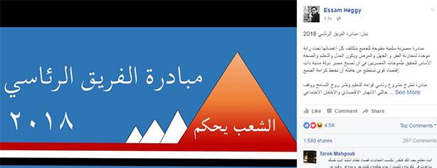 وفي مطلع الشهر الجاري، أطلق العالم المصري بوكالة ناسا للفضاء والمستشار العلمي السابق لرئاسة الجمهورية مصطفى حجي مبادرة تطرح مشروع رئاسي تحت عنوان ” مبادرة الفريق الرئاسي 2018 “على حابه بموقع التواصل الإجتماعي “فيسبوك”.