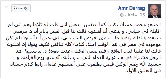 قال الشيخ محمد حسان، الداعية الإسلامي، إن حواره لـجريدة “الوطن”، قد نقل بأمانة، باستثناء وجود خلط يتعلق بالدكتور عمرو دراج أحد قيادات الإخوان، فقد نقل عنه_ على حد قوله_ أن دراج قال له ” لا”، ردًا على الوساطة التي قام بها، وهذا لم يحدث، فهو لم يلتق دراج او يسمعه قط.