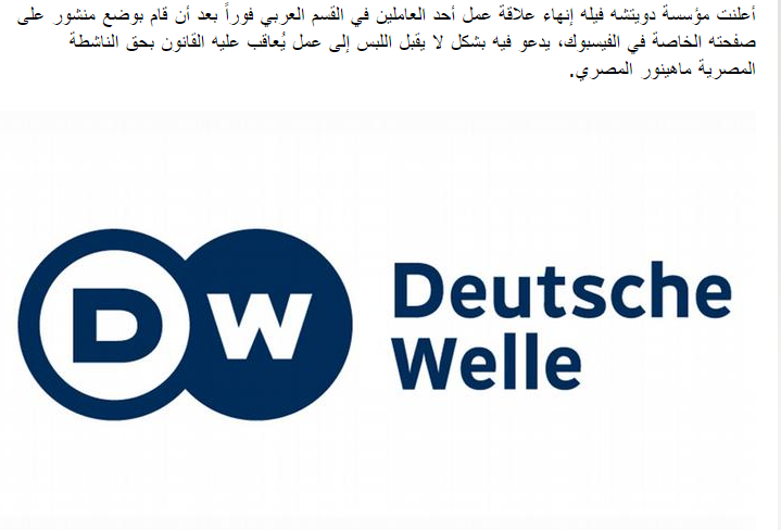 أنهت مؤسسة دويتشه فيله ، تعاقدها مع أحد الصحفيين المصريين العاملين لديها ؛ بسبب منشور نشره علي صفحته علي الفيس بوك ، يدعو إلي التحريض ضد الناشطة ، المفرج عنها مؤخرا ، ماهينور المصري .