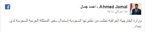 وقال المتحدث باسم الخارجية العراقية أحمد جمال في بيان: إن “وزارة الخارجية العراقية تطلب من نظيرتها السعودية استبدال سفير المملكة العربية السعودية لدى بغداد”.