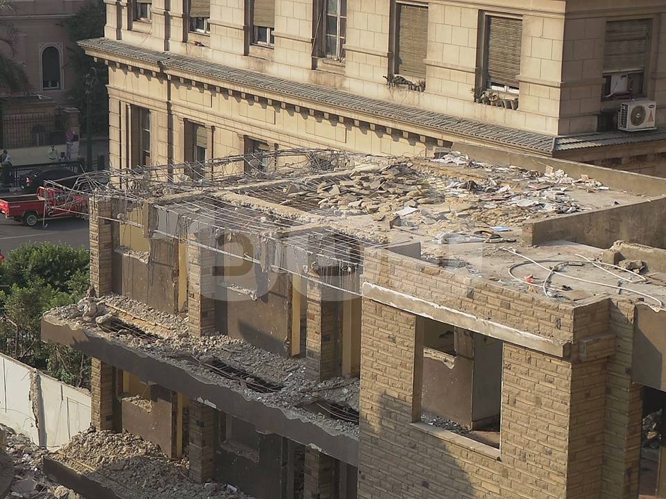 يستمر القطاع الهندسي بوزارة الإنتاج الحربي، في أعمال هدم مبنى نقابة المحامين، كما أزالت المظلات المتواجدة بحديقة النقابة، لتيسير دخول معدات الهدم.