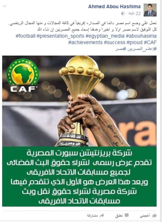 وقال رجل الأعمال المصري أحمد أبوهشيمة، رئيس مجلس إدراة “إعلام المصريين”، عبر صفحته الرسمية بموقع التواصل الاجتماعي “فيس بوك”: “نعمل على وضع اسم مصر دائما في الصداره إفريقيا في المجالات كافة، ومنها المجال الرياضي، كل التوفيق لاسم مصر أولا وأخيرا، وهدفنا إسعاد جميع المصريين إن شاء الله”.