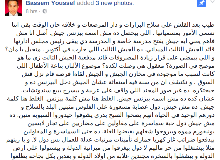 وقال في تدوينة عبر صفحته الرسمية على موقع التواصل الاجتماعي “فيس بوك”: “طيب بعد القلش على سلاح البزازات ودار المرضعات وخلافه حان الوقت بقى إننا نسمي الأمور بمسمياتها، اللي بيحصل ده مش اسمه بيزنس جيش”.