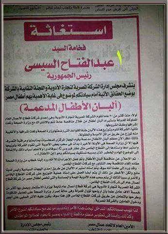 كشفت استغاثة تقدمت بها الشركة المصرية لتجارة الأدوية “حكومية”، إلى عبدالفتاح السيسى، للتدخل وحل أزمة اللبن المدعم، حول إسناد استيراد الألبان المدعمة إلى إحدى الجهات السيادية بالدولة، مشيرة إلى أنها تقوم منذ 20 عامًا باستيراد ألبان الأطفال وتوزيعها من خلال مناقصة عامة مع وزارة الصحة، تحت إشراف الوزارة ووفقًا لشروطها.