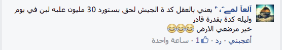 سخر رواد موقع التواصل الاجتماعي “فيس بوك”، من بيان المتحدث العسكري للقوات المسلحة الذي أكد فيه تعاقد القوات المسلحة لاستيراد لبن للأطفال مقابل 30 جنيه للعبوة.